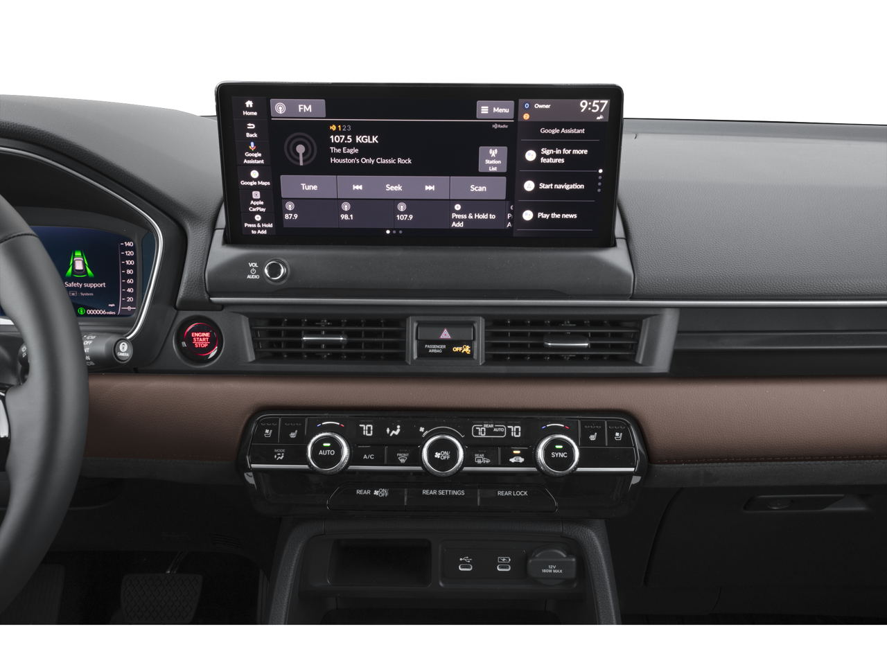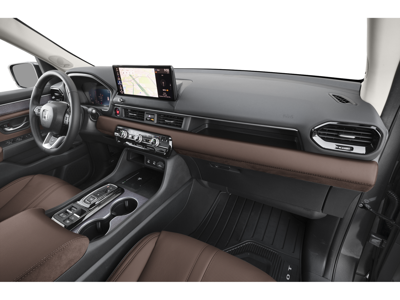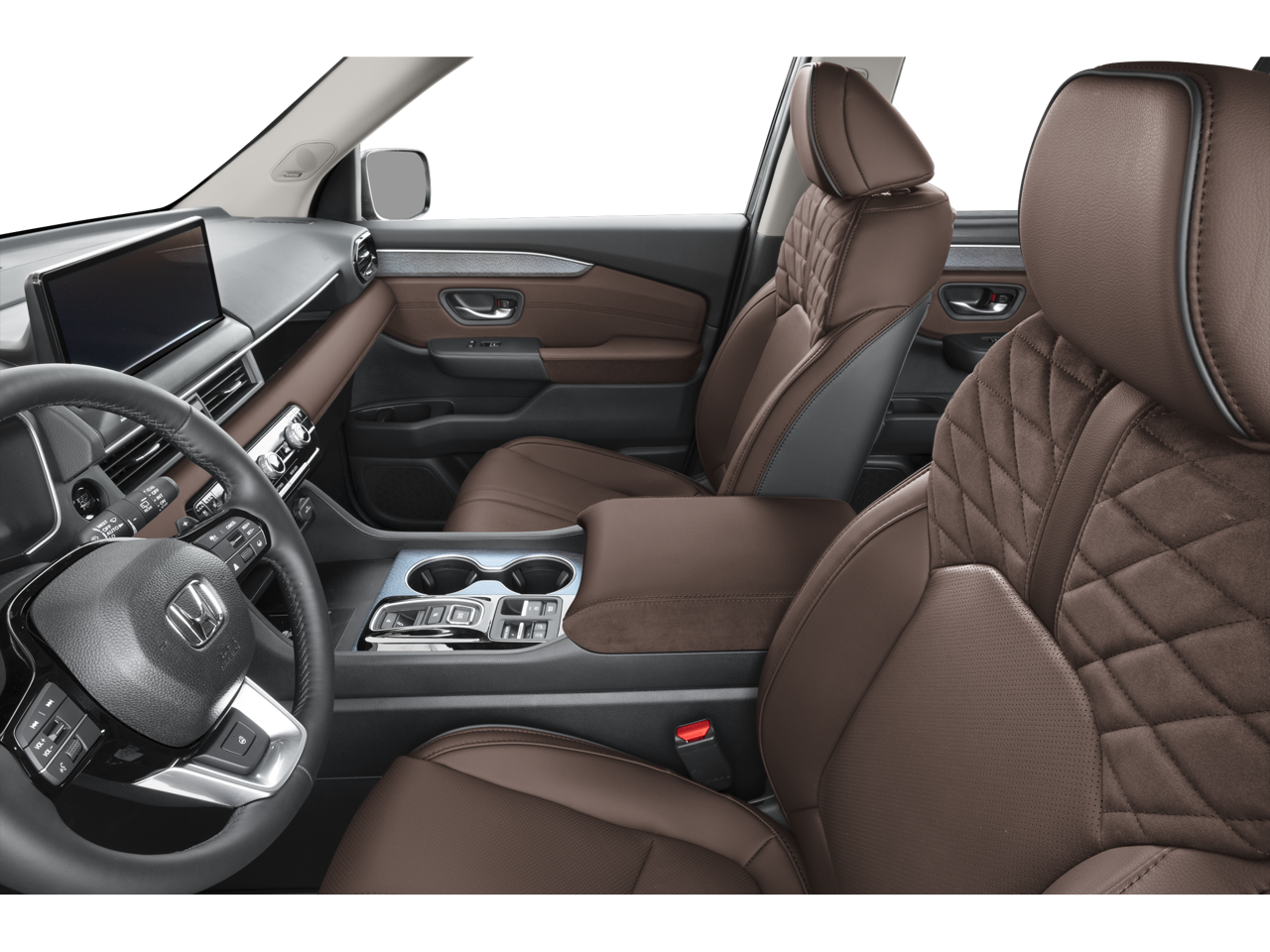12 Speakers, 3rd row seats: split-bench, 4-Wheel Disc Brakes, ABS brakes, Adaptive Cruise Control: Adaptive Cruise Control (ACC) with Low-Speed Follow, Air Conditioning, Alloy wheels, Apple CarPlay/Android Auto, Auto High-beam Headlights, Auto-dimming door mirrors, Auto-dimming Rear-View mirror, Automatic temperature control, Blind Spot Information (BSI) System warning, Bose Premium Sound System, Brake assist, Bumpers: body-color, Compass, Delay-off headlights, Driver door bin, Driver vanity mirror, Dual front impact airbags, Dual front side impact airbags, Electronic Stability Control, Emergency communication system: HondaLink, Exterior Parking Camera Rear, Four wheel independent suspension, Front anti-roll bar, Front Bucket Seats, Front Center Armrest, Front dual zone A/C, Front fog lights, Front reading lights, Fully automatic headlights, Garage door transmitter: HomeLink, Heads-Up Display, Heated and Ventilated Front Bucket Seats, Heated door mirrors, Heated front seats, Heated rear seats, Heated steering wheel, HondaLink, HondaLink Subscription Services, Illuminated entry, Knee airbag, Lane departure: Lane Keeping Assist System (LKAS) active, Low tire pressure warning, Memory seat, Navigation system: Google Maps, Occupant sensing airbag, Outside temperature display, Overhead airbag, Overhead console, Panic alarm, Passenger door bin, Passenger vanity mirror, Perforated Leather-Trimmed Seat Trim, Power door mirrors, Power driver seat, Power Liftgate, Power moonroof, Power passenger seat, Power steering, Power windows, Radio data system, Rain sensing wipers, Rear air conditioning, Rear anti-roll bar, Rear reading lights, Rear seat center armrest, Rear window defroster, Rear window wiper, Reclining 3rd row seat, Remote keyless entry, Security system, Speed control, Speed-sensing steering, Speed-Sensitive Wipers, Split folding rear seat, Spoiler, Steering wheel mounted audio controls, Tachometer, Telescoping steering wheel, Tilt steering wheel, Traction control, Trip computer, Turn signal indicator mirrors, Variably intermittent wipers, Ventilated front seats, and Wheels: 20 Shark Gray Machined Face.